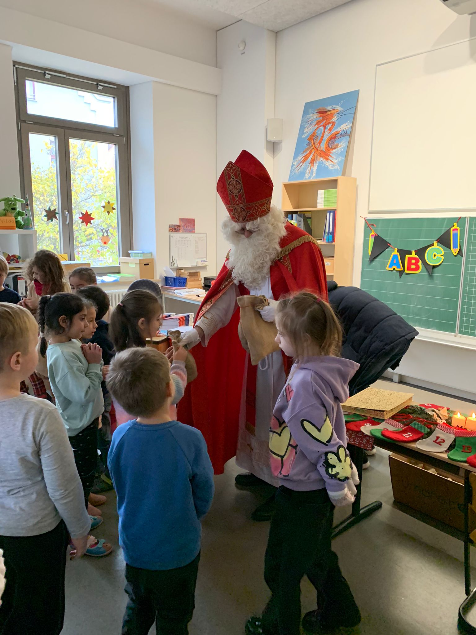 Am 5. Dezember besuchte der Nikolaus mit Unterstützung von Herrn Orhan die 1. und 2. Klassen der Luitpold GS. Für jede Klasse hatte er treffende Worte parat, die er aus seinem goldenen Buch vorlas. Natürlich gab es für jedes Kind auch ein liebevoll gefülltes Nikolaussäckchen, in dem Nüsse, Mandarinen und andere Kleinigkeiten zu finden waren. Für die Kinder war der Besuch eine gelungene Überraschung.