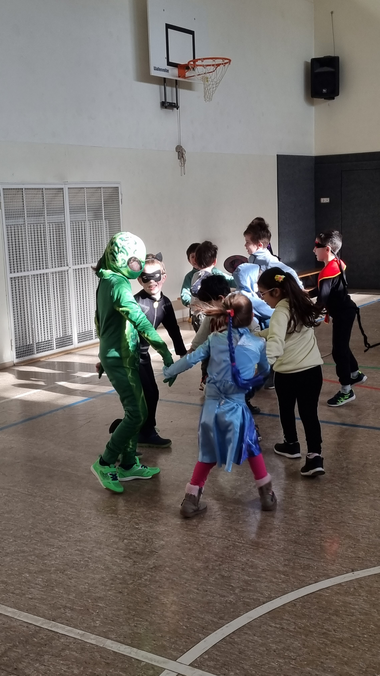 Am gumpigen Donnerstag feierten die Vorschulkinder vom Schleiermacherkindergarten mit der 2c dann in der Turnhalle eine Faschingsparty. Bei Musik, Tanz und lustigen Spielen kamen sich die, in tollen Kostümen verkleideten Schul- und Kindergartenkinder näher und hatten viel Spaß. Die Zeit verging wie im Flug.