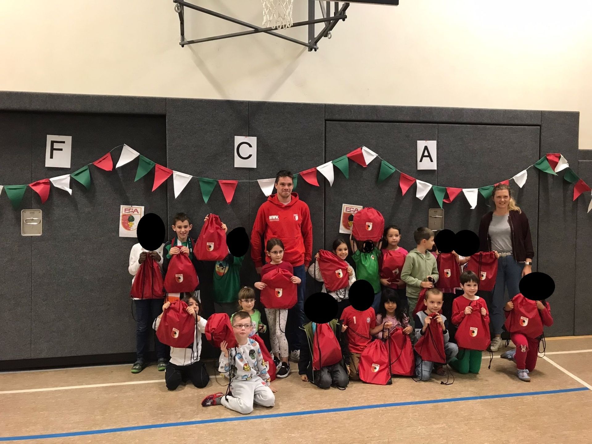 Am 13. Oktober hatten die Erstklässler die Freude, Besuch von einem Bundesligaspieler des FC Augsburg zu bekommen. Schulleiterin Fr. Baka Méndez begrüßte in unserer Turnhalle Raphael Framberger. Die Kinder durften ihm Fragen stellen und ein paar Fotos mit ihm machen. Gemeinsam sangen sie die FCA-Hymne und präsentierten stolz ihre Fanartikel. Zu Ende des Besuches bekamen die Schülerinnen und Schüler einen Turnbeutel als Geschenk.